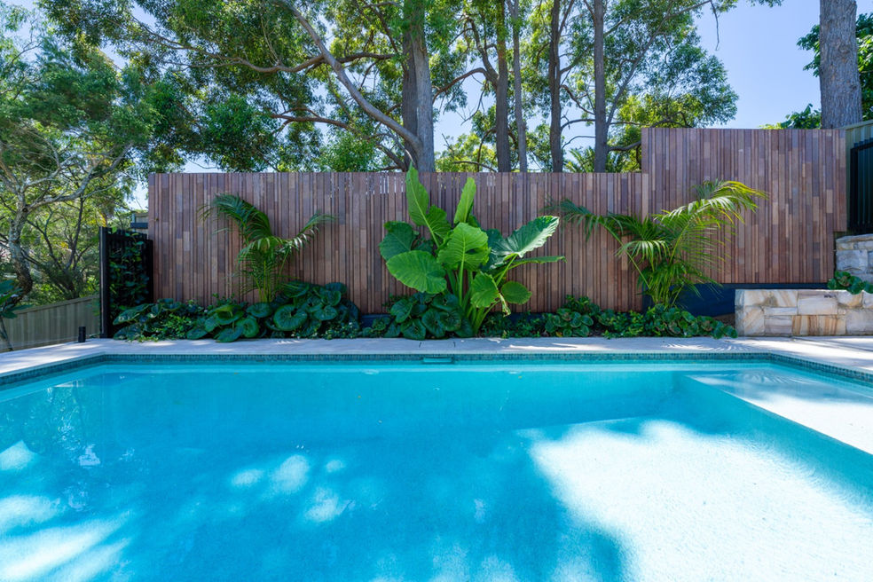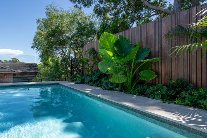 Unity, variety, repetition and texture are paramount throughout the design, with the curved shape of the pool’s front corner reverberating through the custom glass pool fence, raised wall and Corten steel garden beds beneath, and the French lay stone cladding on the rear wall reflected in a smaller French lay travertine tiles on the pool’s front curved wall. Black aluminium feature fencing provides sharp lines to contrast softer organic elements and textures elsewhere and is repeated either side of the pool with a gorgeous array of rich green tropical planting adding vibrance and fragrance to the space.